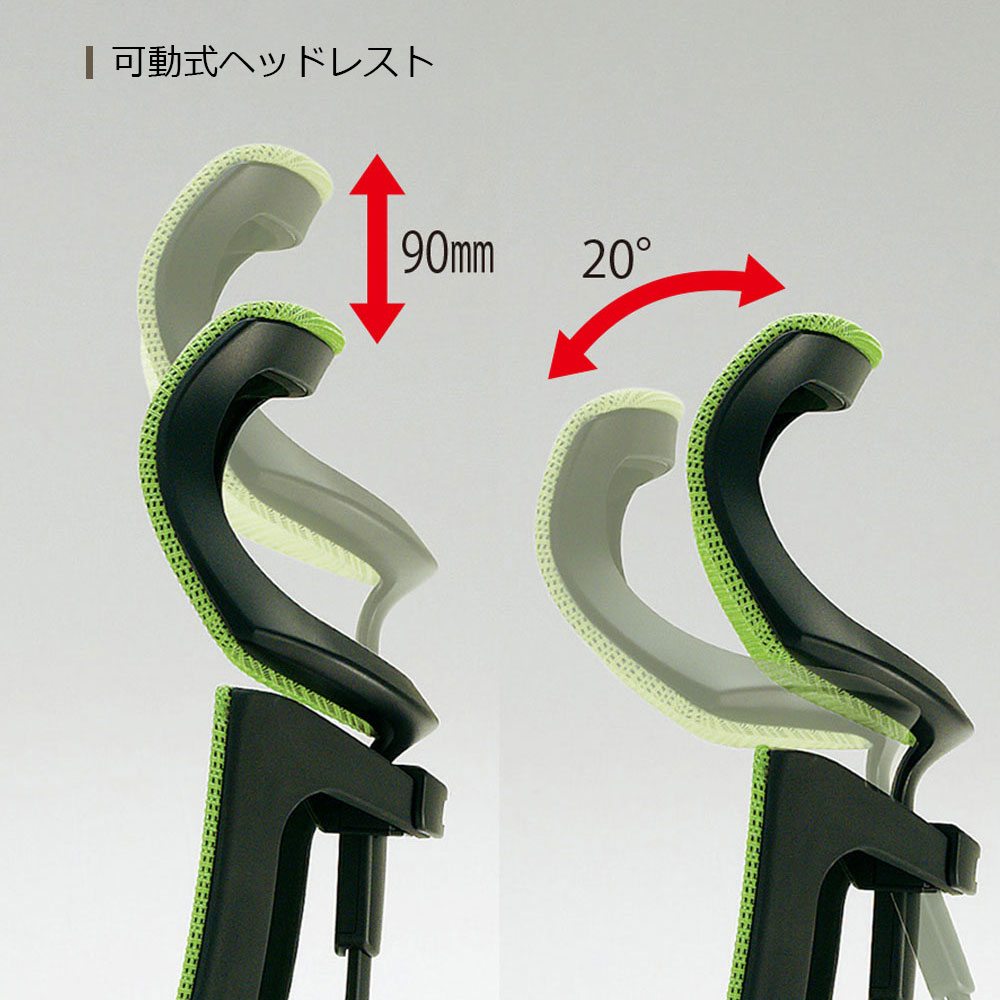 後頭部をやさしく支えるワイドタイプの可動タイプヘッドレスト。ヘッドレストは上下90mm、前後20°の角度調整が可能です。