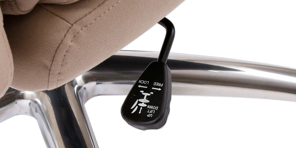 座面下のレバーで座面の高さ調節(45〜50cm)とロッキングのロック/解除の操作が行えます。センターロッキングは昇降シリンダーを支点に背と座の角度は一定のまま後ろに倒れます。