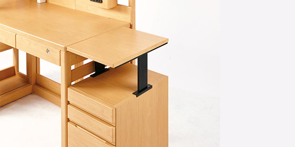 ワゴンの天板は1.5cmピッチで10段階に昇降できます。最上段まで上げるとデスク天板と同じ高さで机上を広く使えます。