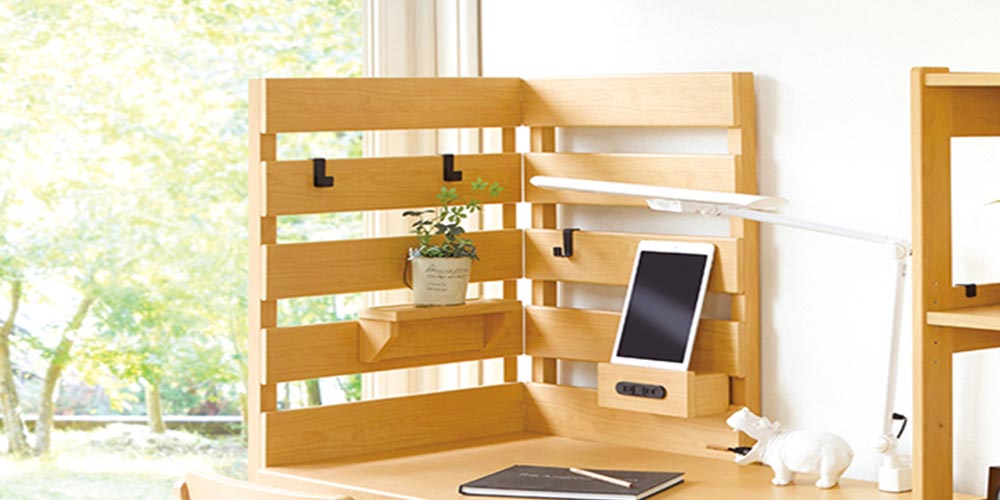 2枚1組のラダーパネルをデスクと組合わせて自由な空間を創造する新発想のデスクシリーズです。L字型に組み換えることで間仕切りにもなり、リビング学習やダイニング学習、在宅ワーク、オンライン授業に最適な環境を作り出します。