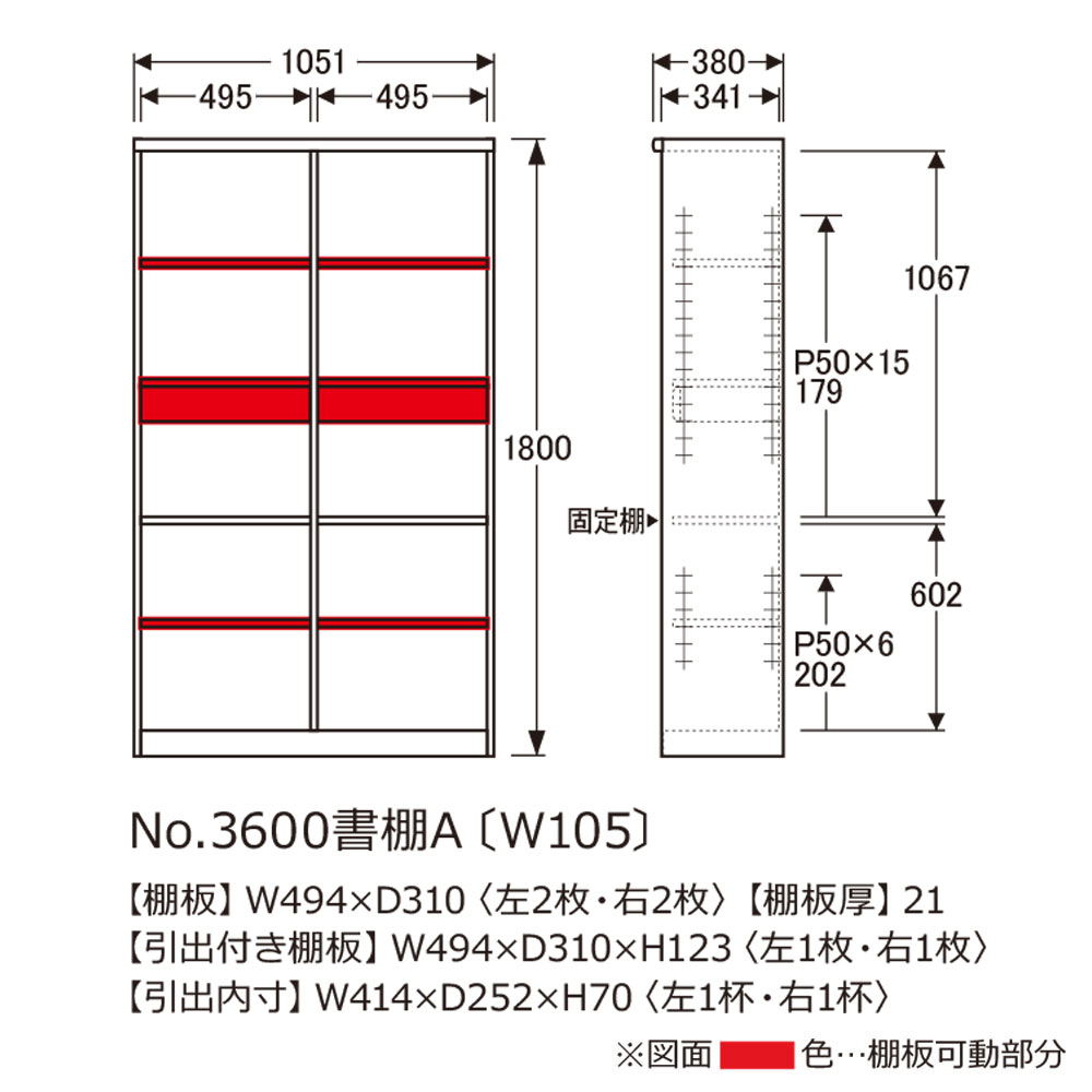 浜本工芸 書棚「No.3600A・No.3608A」オープンタイプ 幅105.1cm 高さ180cm 全2色[No.3600]