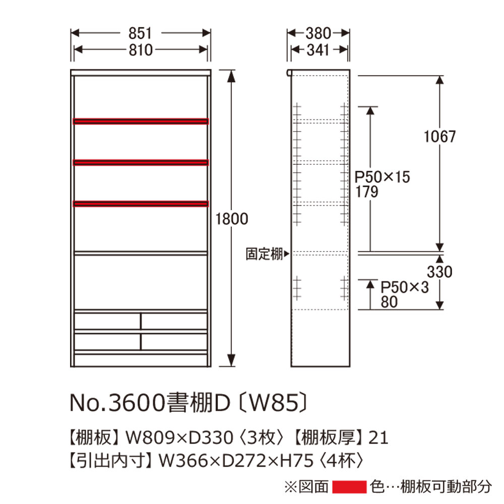 ナラ材の豊かな風合いが魅力の書棚「No.3600D・3608D」W85