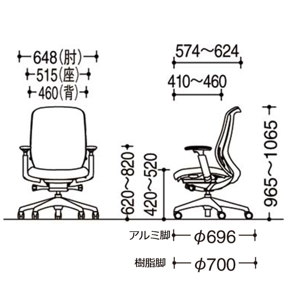 幅(肘含む)648x奥行574〜624x高さ(背)965〜1065