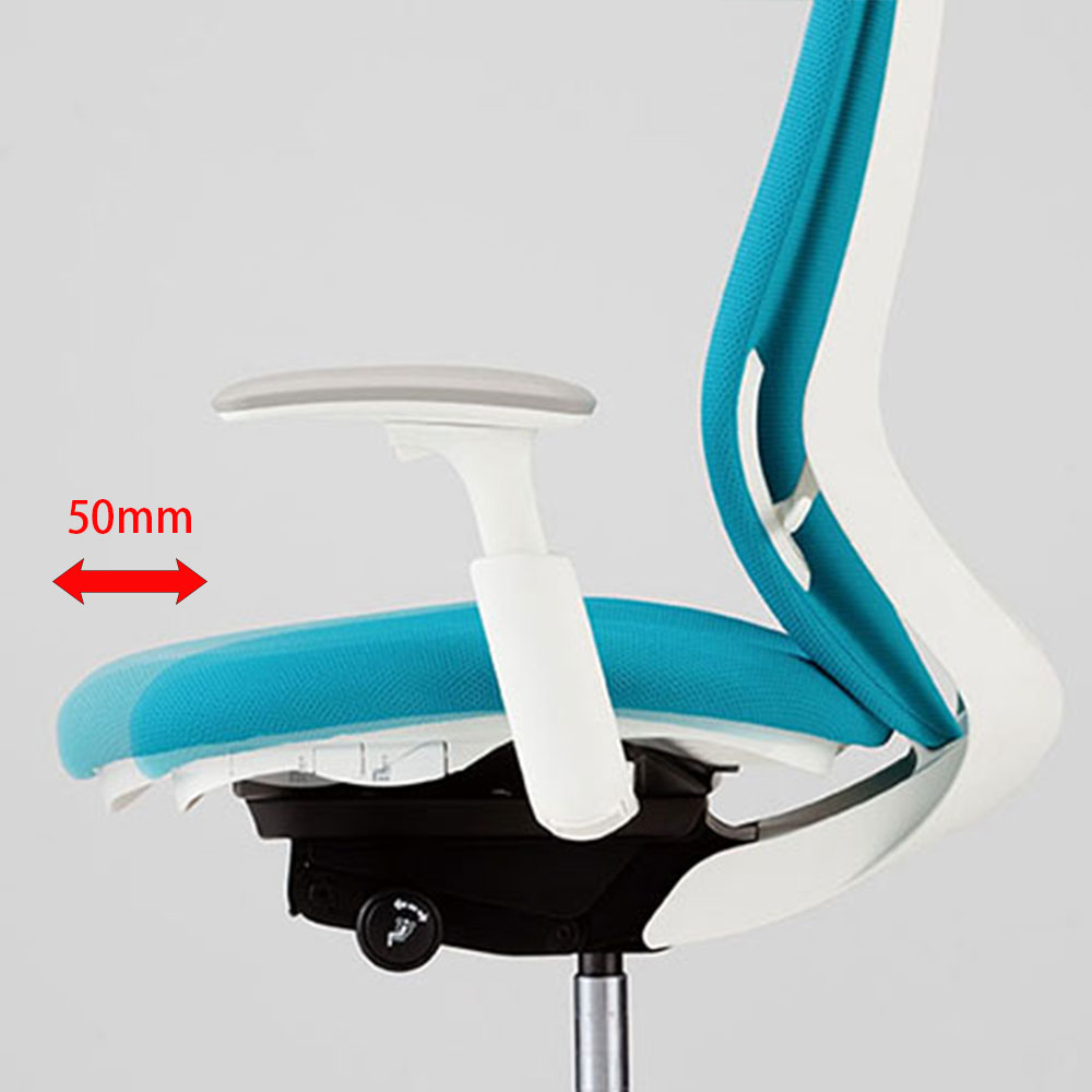 座面の左にあるレバー操作により、座面の奥行き調節が可能です。(ストローク:50mm)