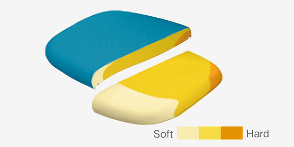 硬さの異なる3種類のウレタンを一体で成型しました。前方は、太腿を圧迫しない柔らかな座り心地のクッション。後方には、お尻をし っかりサポートする硬めのクッションを採用しました。