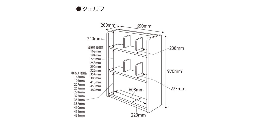 ※上段の棚板は固定となります。下段は可動棚となっており、約3cmピッチ・11段階で調節が可能です。また、4枚の仕切り板は取付後、横にスライドして位置を調整できます。