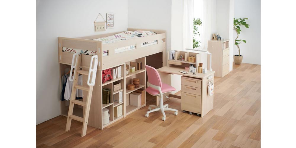 ベッド、デスク、書棚がシリーズでコーディネートできます。最初はセット、大きくなるとセパレートしてお使いいただけます。