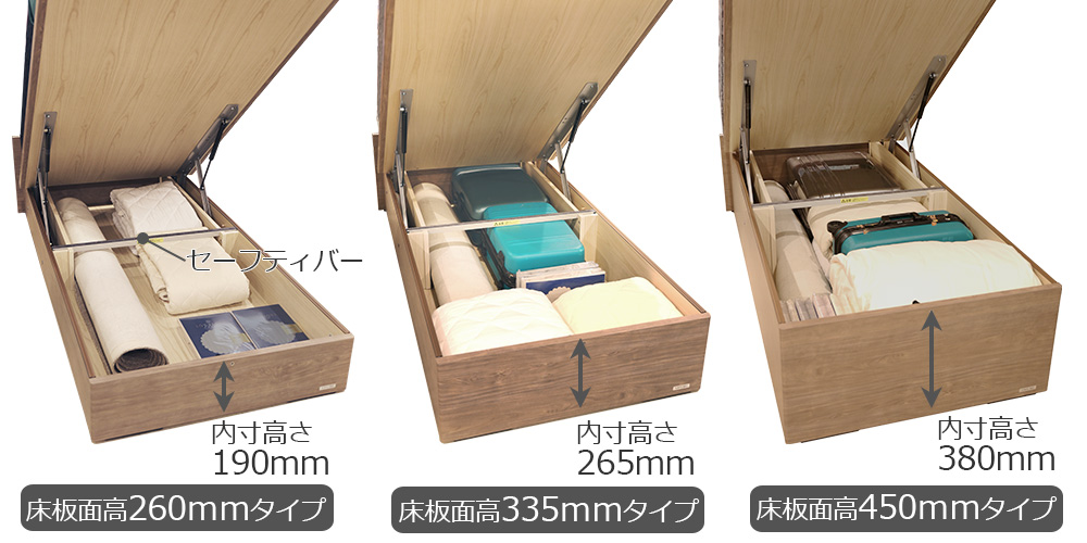 床板面高260、335、そして450mmの大容量タイプまで、マットレスとのバランスや必要な収納量に合わせて3タイプからお選びいただけます。床板のパネルに十分な強度がありますが、より安全にお使いいただけるよう中央にセーフティバーを標準装備しています。簡単に脱着可能ですので邪魔になりません。※画像は収納イメージです。