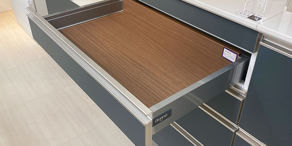高い性能を誇るヘティヒ社のイノテックの引出しに先進のデザインが融合。エッジの効いたスクエアフォルムがキッチンに映えるイノテック・アティラを採用しています。収納物を満載してもなめらかに開閉します。(レール耐荷重:30kg)また、食器など重いものを収納することが多い引き出しには1.5cmの厚みのある床板を採用しています。※画像はスタインシリーズのイメージです。