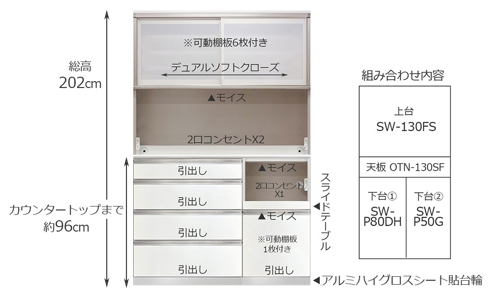アルミフレームをより細く、背板をアルミマット仕上げにすることでスタイリッシュな印象です。家電の使い勝手が良いハイカウンターに加え、引出しには上下どちらからでも指を掛けられるラインハンドルを採用するなど、機能性に優れたオープンボードです。圧迫感の少ないパールホワイト色です。パーツを組み合わせているため、家電収納は左右どちらにも組み立て可能です。※画像はイメージです。