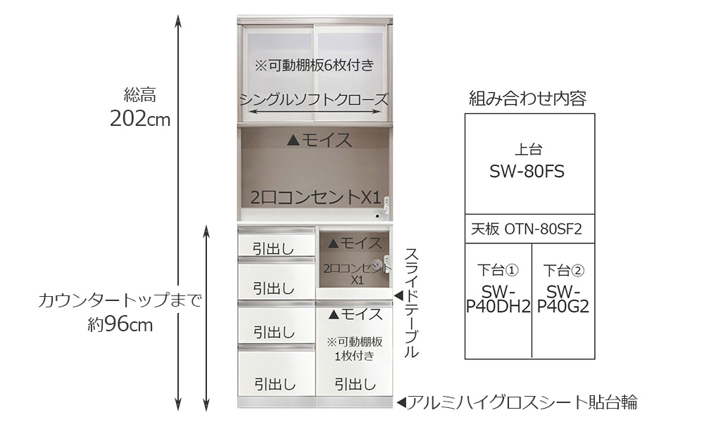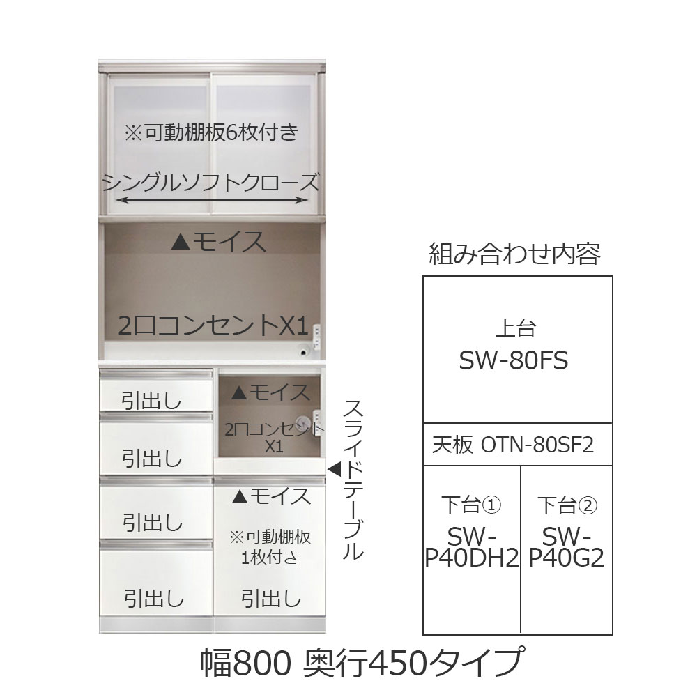 アルミフレームをより細く、背板をアルミマット仕上げにすることでスタイリッシュな印象です。家電の使い勝手が良いハイカウンターに加え、引出しには上下どちらからでも指を掛けられるラインハンドルを採用するなど、機能性に優れたオープンボードです。スリムな奥行45cmタイプのパールホワイト色です。パーツを組み合わせているため、家電収納は左右どちらにも組み立て可能です。※画像はイメージです。