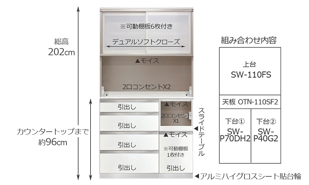 アルミフレームをより細く、背板をアルミマットにすることでスタイリッシュな印象に仕上げています。家電の使い勝手が良いハイカウンターに加え、引出しには上下どちらからでも指を掛けられるラインハンドルを採用するなど、機能性に優れたオープンボードです。スリムな奥行45cmタイプのパールホワイト色です。パーツを組み合わせているため、家電収納は左右どちらにも組み立て可能です。※画像はイメージです。