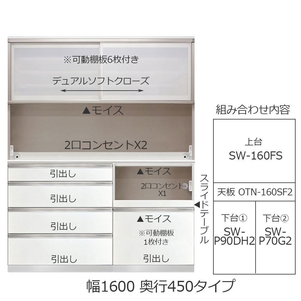 アルミフレームをより細く、背板をアルミマット仕上げにすることでスタイリッシュな印象です。家電の使い勝手が良いハイカウンターに加え、引出しには上下どちらからでも指を掛けられるラインハンドルを採用するなど、機能性に優れたオープンボードです。スリムな奥行45cmタイプのパールホワイト色です。パーツを組み合わせているため、家電収納は左右どちらにも組み立て可能です。※画像はイメージです。