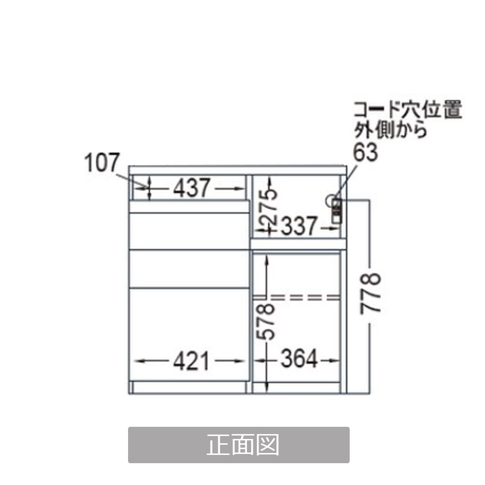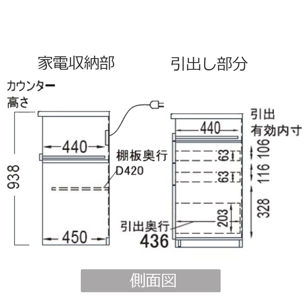 家電収納部下を、オープンスペースにすることにより、引出しには収納しづらいものを置くことができます。可動棚1枚付き。※カスタマイズで引出しを取り付けることもできます。別途料金がかかります。詳しくはお問合せください。