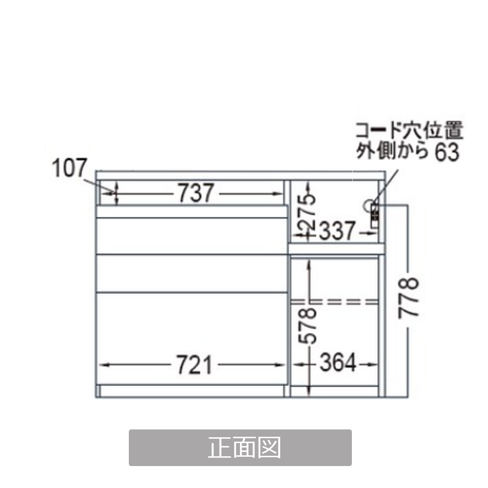 家電収納部下を、オープンスペースにすることにより、引出しには収納しづらいものを置くことができます。可動棚1枚付き。※カスタマイズで引出しを取り付けることもできます。別途料金がかかります。詳しくはお問合せください。
