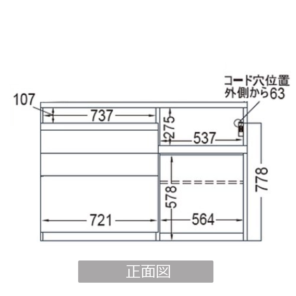 家電収納部下を、オープンスペースにすることにより、引出しには収納しづらいものを置くことができます。可動棚1枚付き。※カスタマイズで引出しを取り付けることもできます。別途料金がかかります。詳しくはお問合せください。