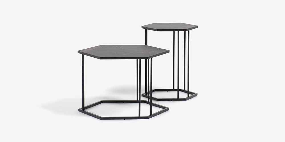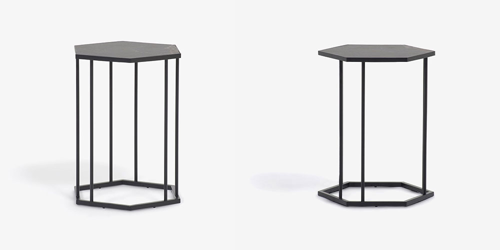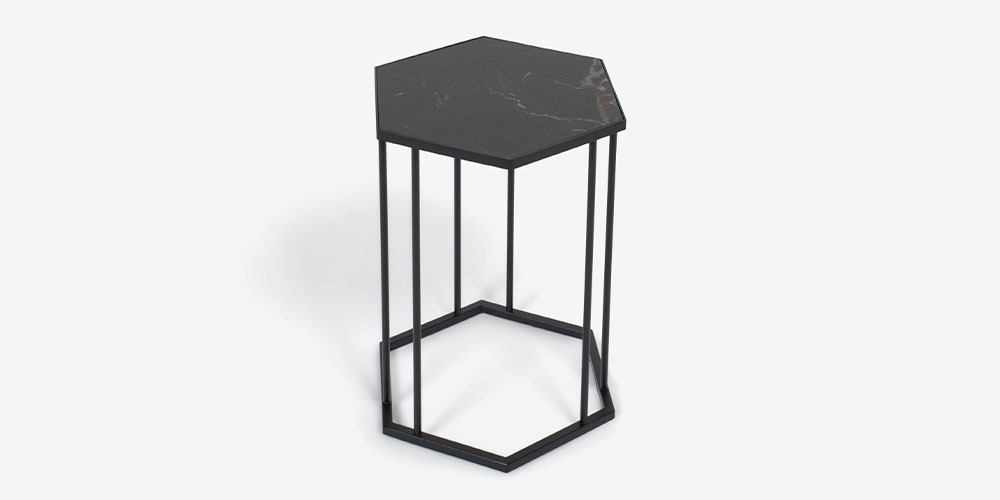 六角形の幾何学的なフォルムにマットブラックのフレームとセラミック(カルカッタブラックマーブル)の組み合わせが、コンパクトながら存在感がありお部屋のアクセントになります。
