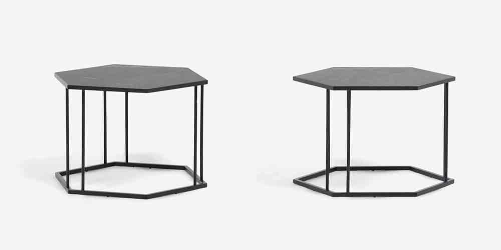 六角形の幾何学的なフォルムにマットブラックのフレームとセラミック(カルカッタブラックマーブル)の組み合わせが、コンパクトながら存在感がありお部屋のアクセントになります。
