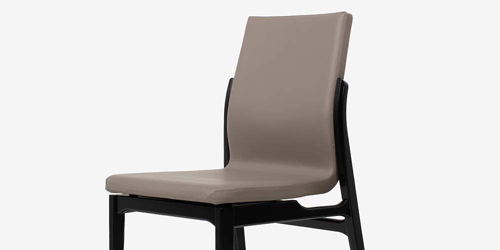 ダイニングチェア「ジュネーブ」は革張りのシートとブラック色に仕上げたビーチ材のフレームとの組み合わせがモダンな印象です。