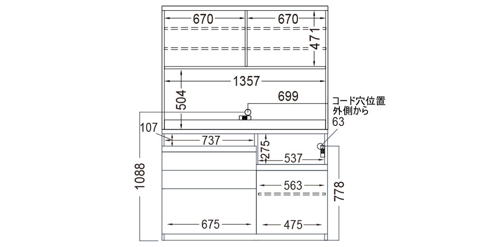 | 家電収納部分 | 幅537x奥行440x高さ275 |