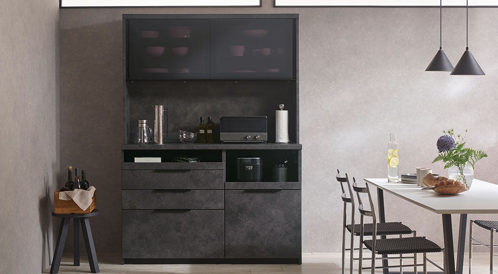 多彩な使い方ができるオープンスペースや、グレードの高いイノテックレールを使用した深さの異なる引出しなど、キッチンに欲しい収納と機能を揃えたオープンボードです。お部屋のインテリアに合わせて選べるセラミカネロ、グレイッシュナット、パールホワイトの3色展開です。スリムな奥行き44.5cmタイプです。※画像はイメージです。