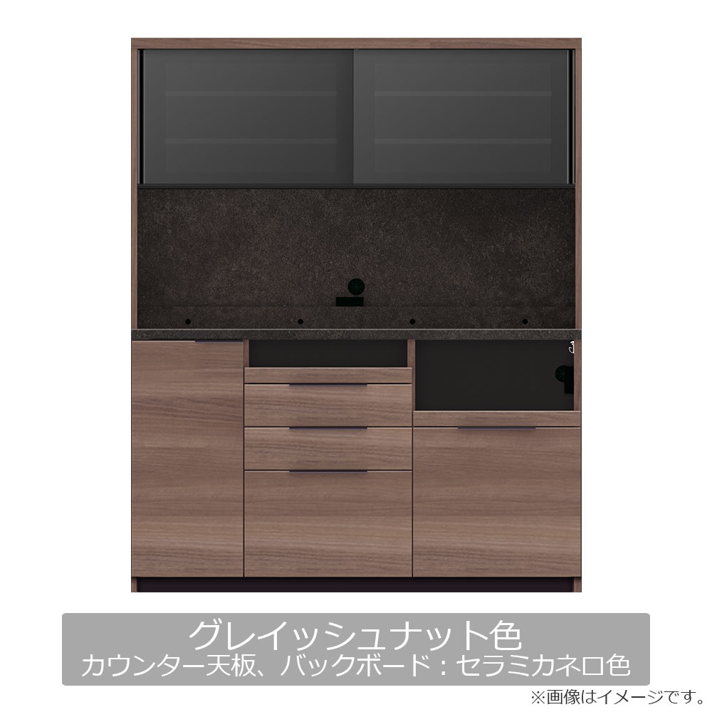 バッグボード・カウンター天板:セラミカネロ/外装:グレイッシュナット/下台内装:ブラック/引手:ブラック/コンセント:ブラック