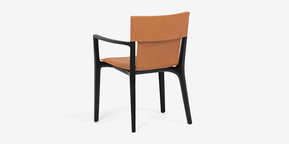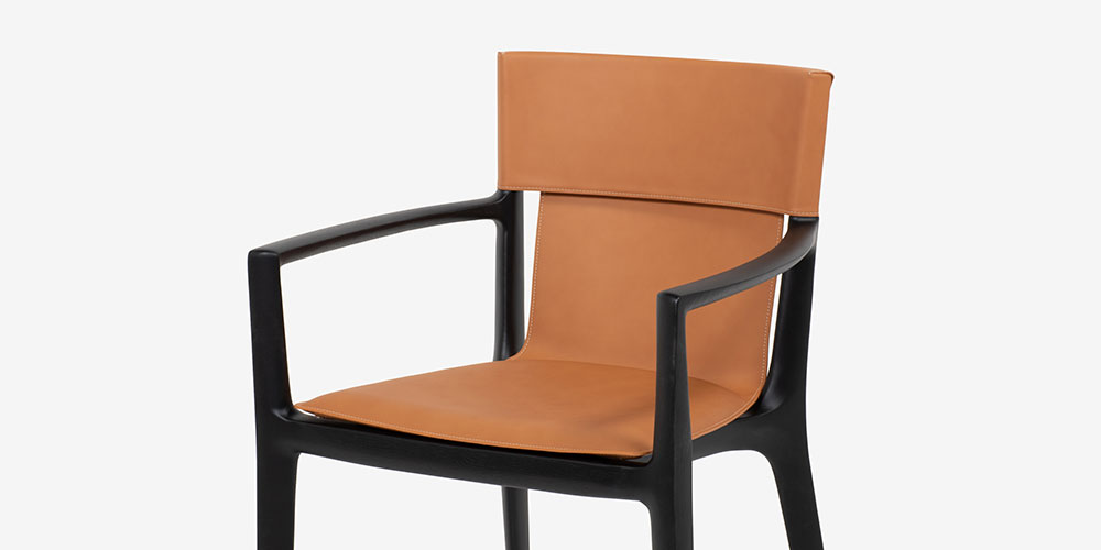 木製のフレームを包み込むサドルレザーの張地は、まるで宙に舞っているような軽やかな印象です。また、背もたれとフレームの間のわずかな空間が躍動感を感じさせます。