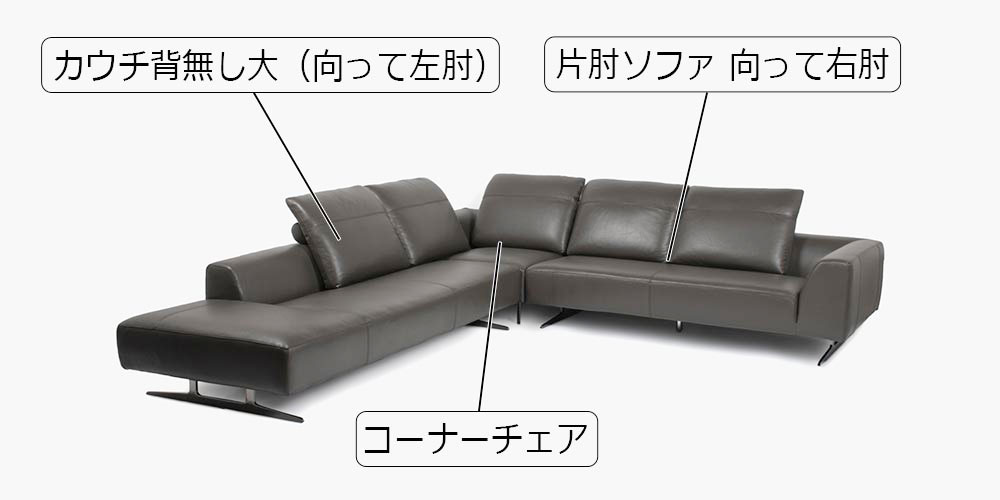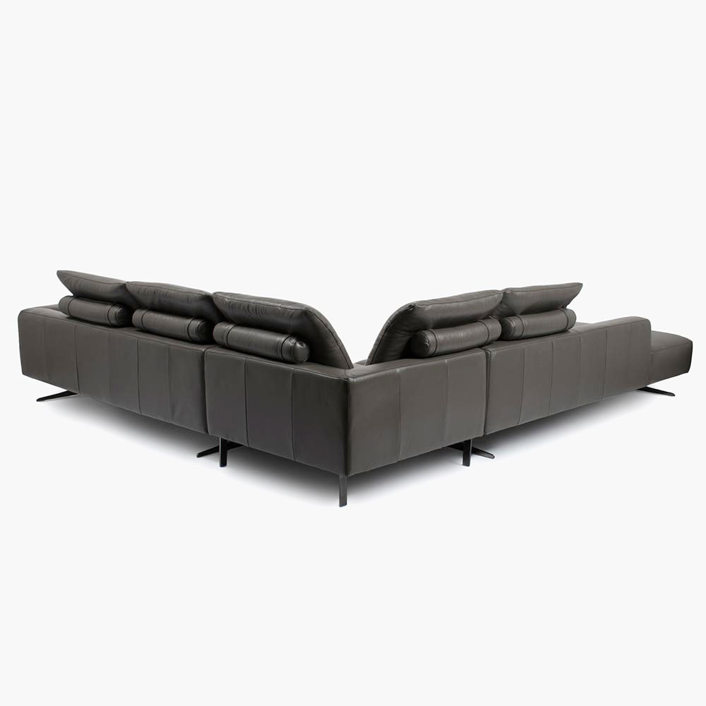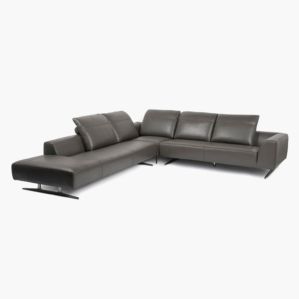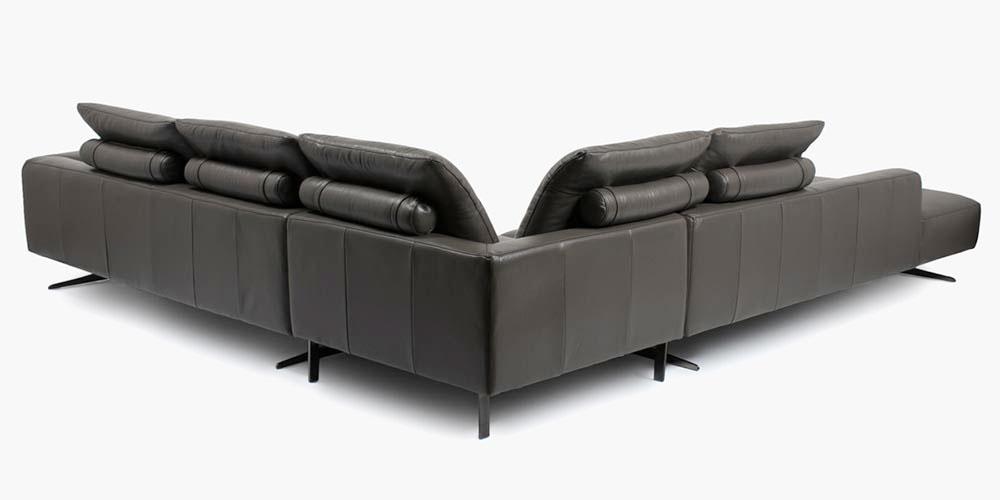 スタイリッシュな脚部が浮遊感を演出する本革張りのコーナー型のカウチソファです。グラファイトカラーの本革とブラックニッケル色の金属脚がモダンな印象です。