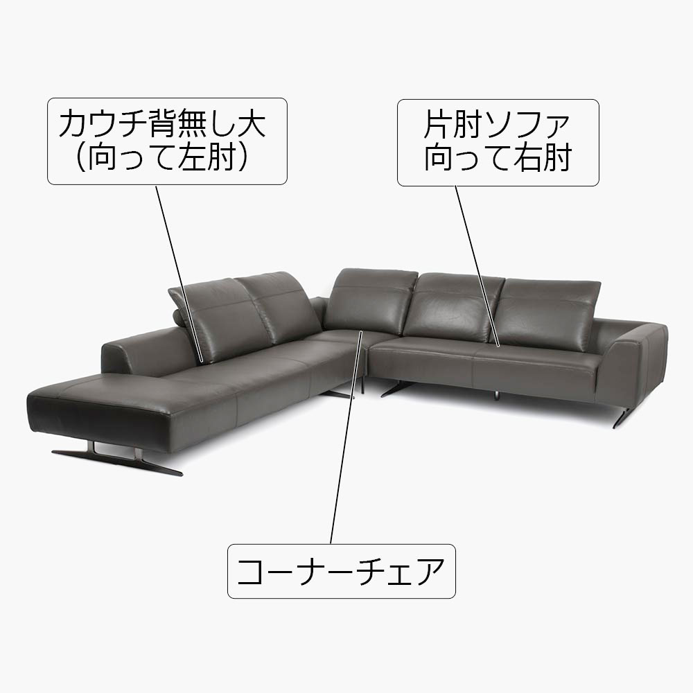 コーナーカウチソファ 3点セット「L/S 59(エルエス59)」321x287cm カウチ背無し大(向って左肘)+コーナーチェア+片肘ソファ向って右肘 革グラファイト色 #J-112E