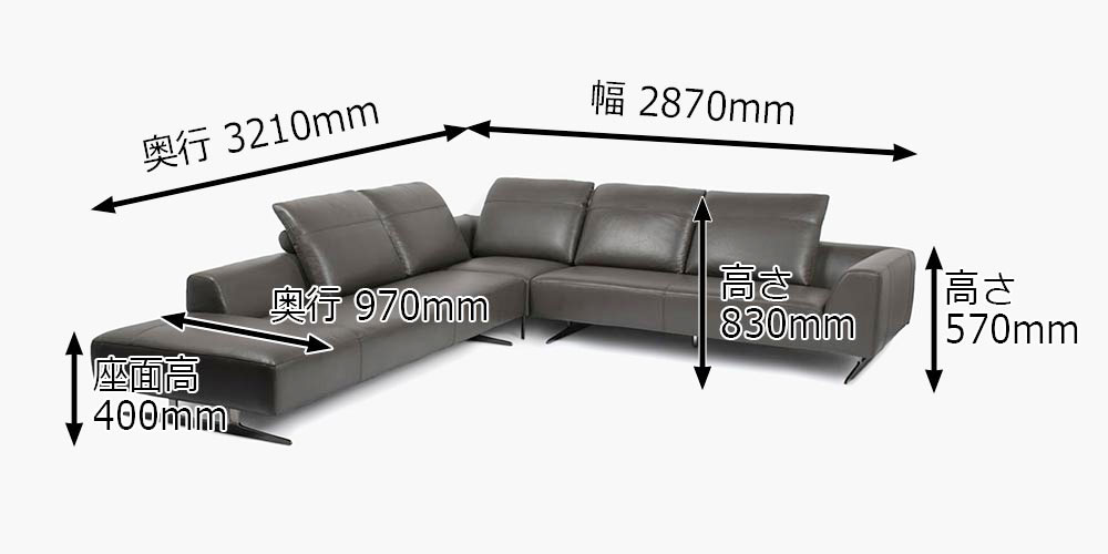 | カウチソファ全体 | 幅2870x奥行3210x高さ830 座面高400 肘(背)高570 |