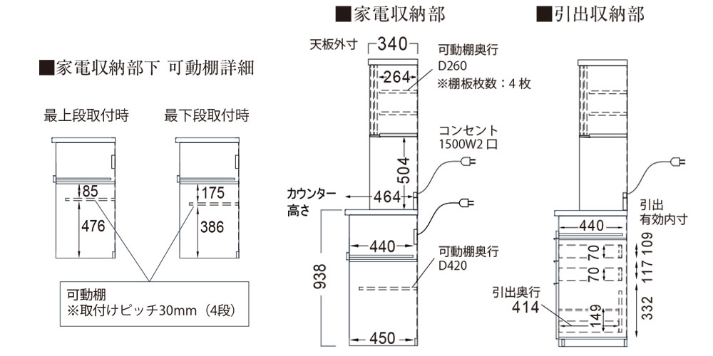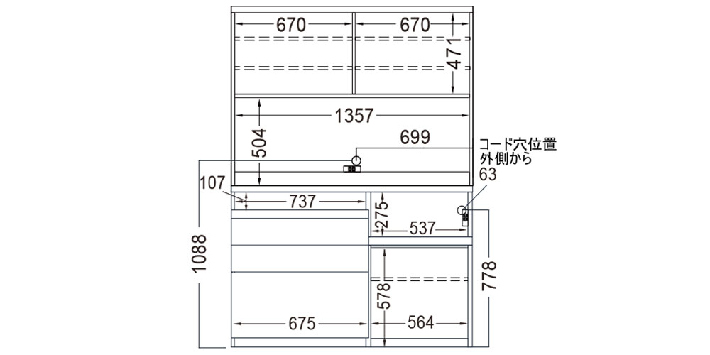 | 家電収納部分 | 幅537x奥行440x高さ275 |