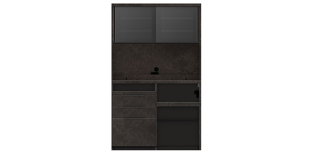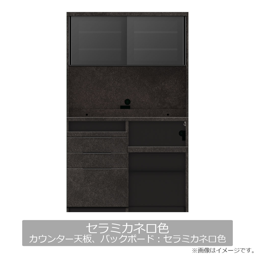 バッグボード・カウンター天板、外装:セラミカネロ/下台内装:ブラック/引手:ブラック/コンセント:ブラック