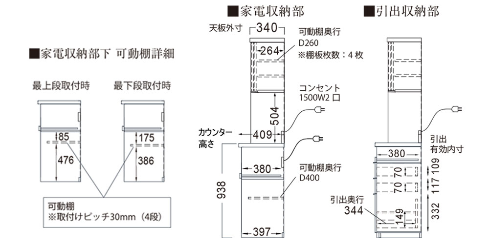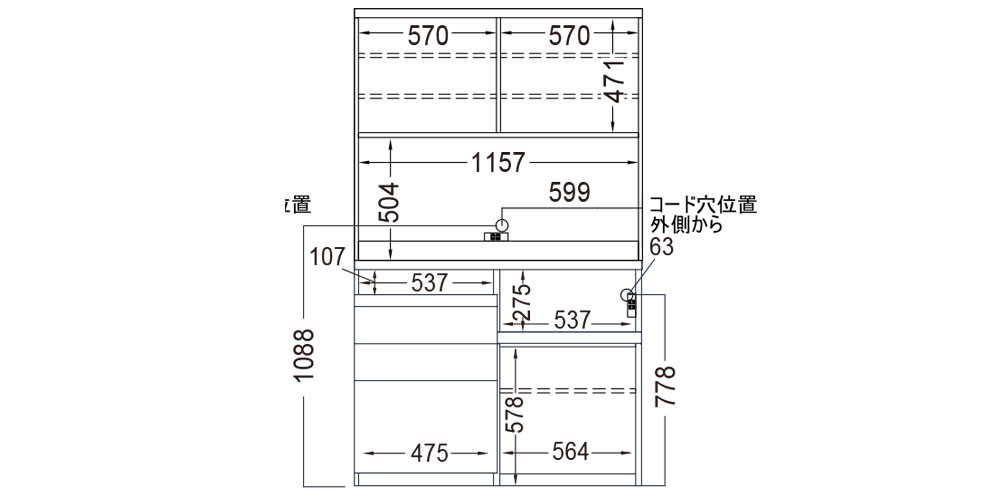 | 家電収納部分 | 幅537x奥行380x高さ275 |