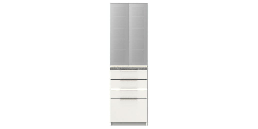 オープンボードと並べることで収納力をアップできるIDシリーズのサイドアイテムです。開き扉と4段引出しでたっぷり収納ができます。お部屋のインテリアに合わせて選べるパールホワイト、セラミカネロ、グレイッシュナットの3色展開です。※画像はイメージです。
