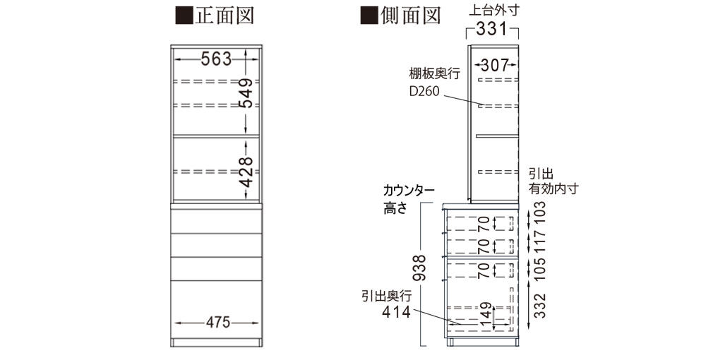 引手を含む奥行き外寸は512mmです。※点線部:可動棚板、引出し
