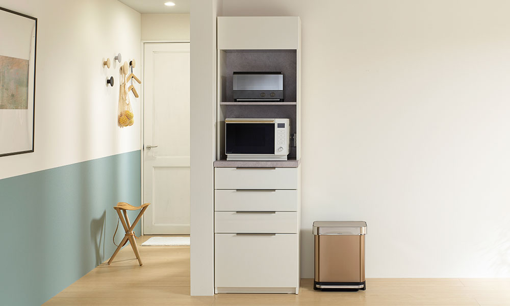可動棚板付きで家電を設置しやすいオープンスペースと引出し収納