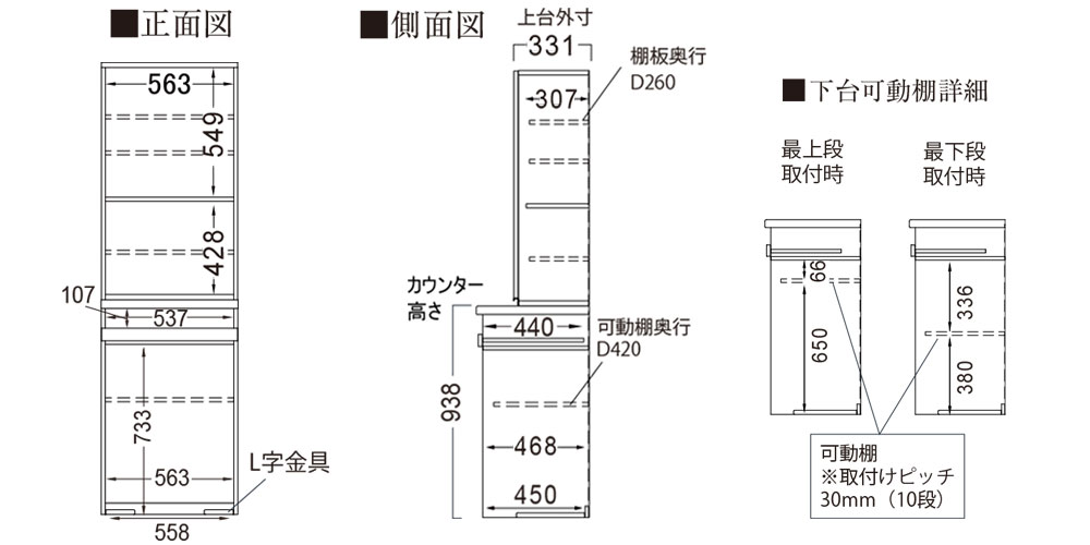 上台の開き扉内は固定棚1枚と可動棚板3枚になっており、収納するものに合わせて棚板の間隔を調節可能です。スライドテーブル仕様のサービステーブルはさっと取り出すことができ、使用頻度の高いものの収納に便利です。また、作業時の補助テーブルとしてもお使いいただけるので、限られたキッチンスペースを有効活用できます。