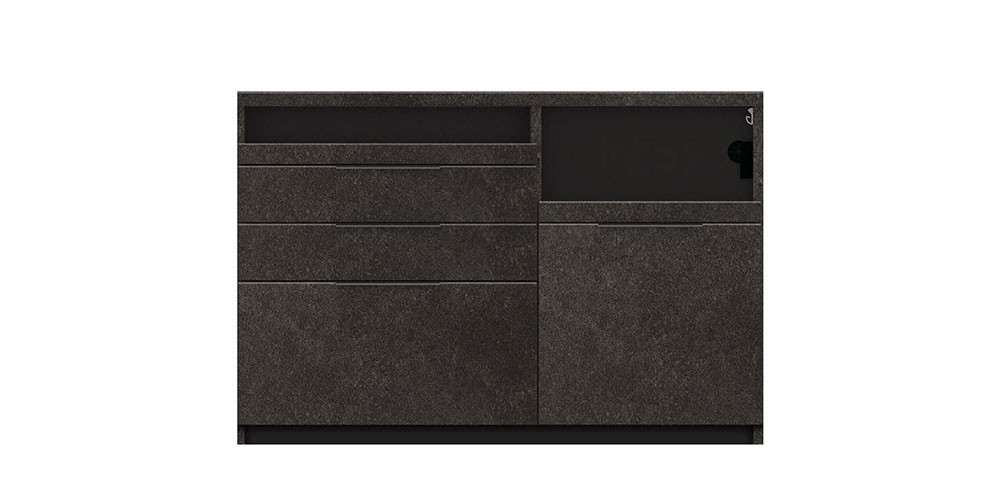 多彩な使い方ができるオープンスペースとグレードの高いイノテックレールを使用した深さの異なる引出しを備え、キッチンに欲しい収納と機能を揃えたカウンターです。お部屋のインテリアに合わせて選べるセラミカネロ、グレイッシュナット、パールホワイトの3色展開です。※画像はイメージです。