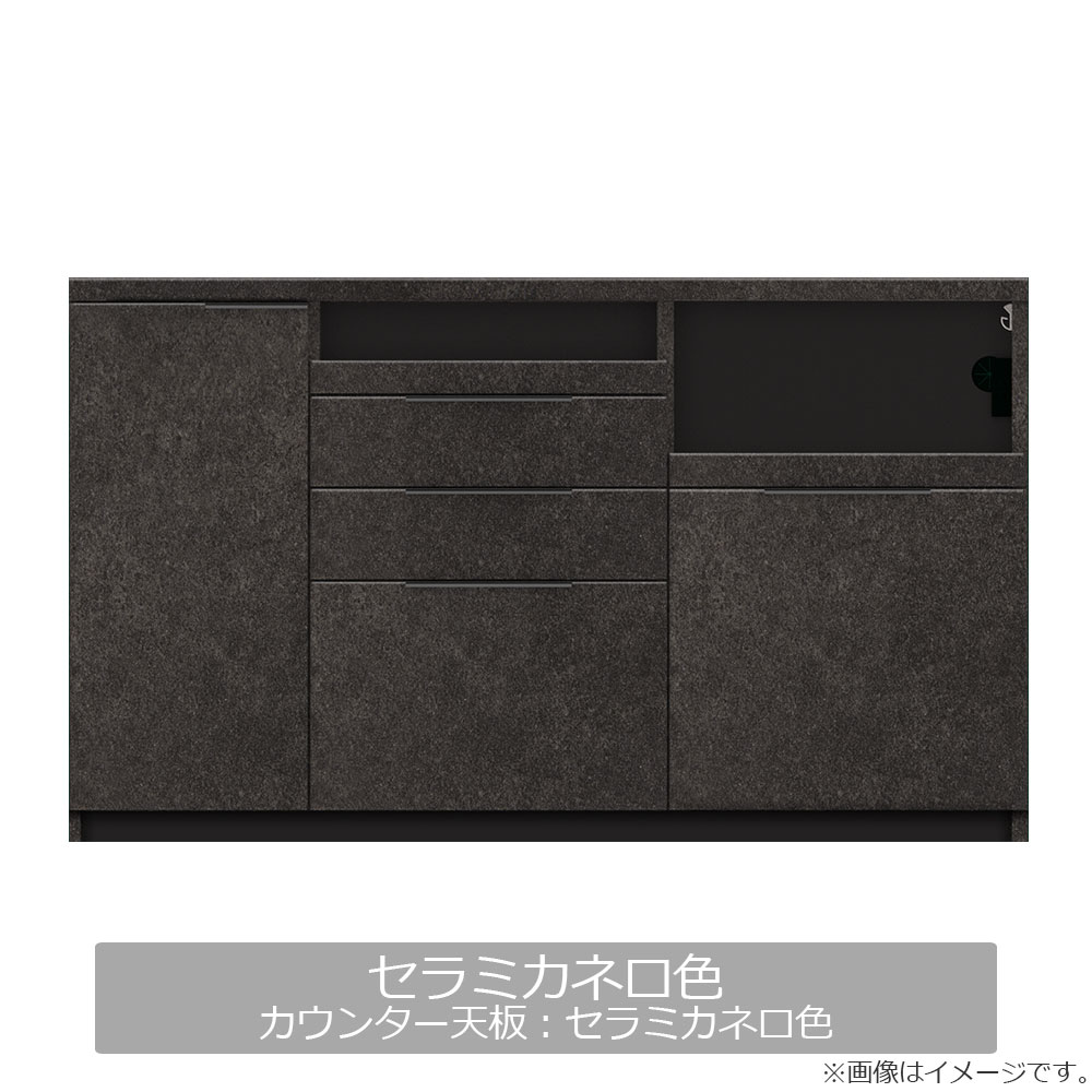 石目調のダーク系カラーが空間を引き締めるセラミカネロ色。セラミックのキッチンやテーブルとのコーディネートにもおすすめです。SmartNANO®トップ使用。【カウンター天板、外装:セラミカネロ/下台内装:ブラック/引手:ブラック/コンセント:ブラック】※画像はサイズ違いのコーディネートイメージです。