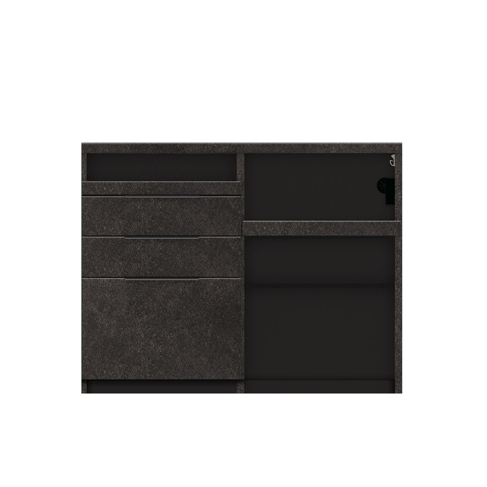 石目調のダーク系カラーが空間を引き締めるセラミカネロ色。セラミックのキッチンやテーブルとのコーディネートにもおすすめです。SmartNANO®トップ使用。【カウンター天板、外装:セラミカネロ/下台内装:ブラック/引手:ブラック/コンセント:ブラック】※画像はIDシリーズのイメージです。