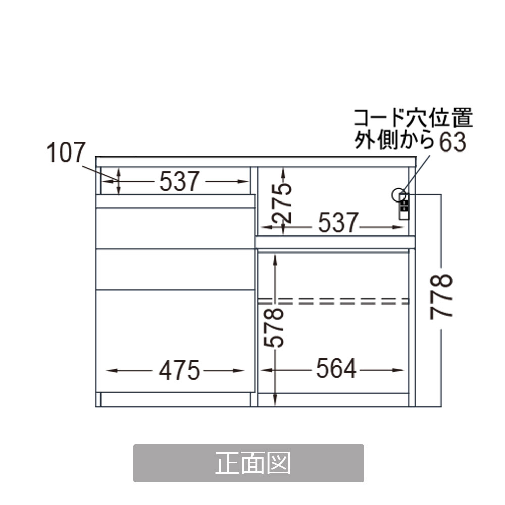 家電収納部分:幅537x奥行380x高さ275