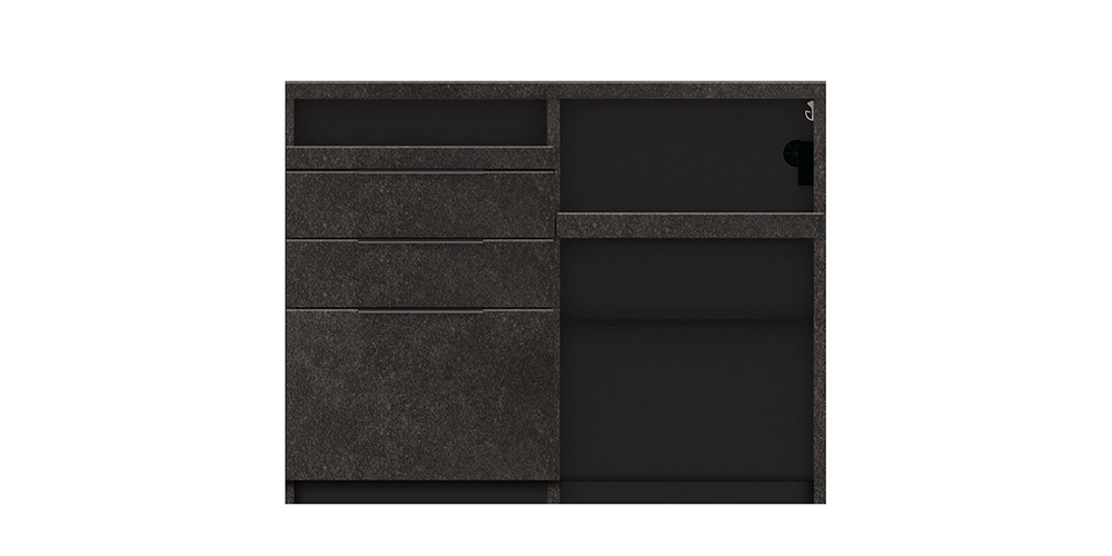 奥の物まで見渡すことができ、収納に便利なフルスライド引出し3杯付きです。ヘティヒ社のイノテックレールを使用し、食器などを収納した状態でもなめらかに引き出せます。引出し内装は全カラー共通でマットグレーです。