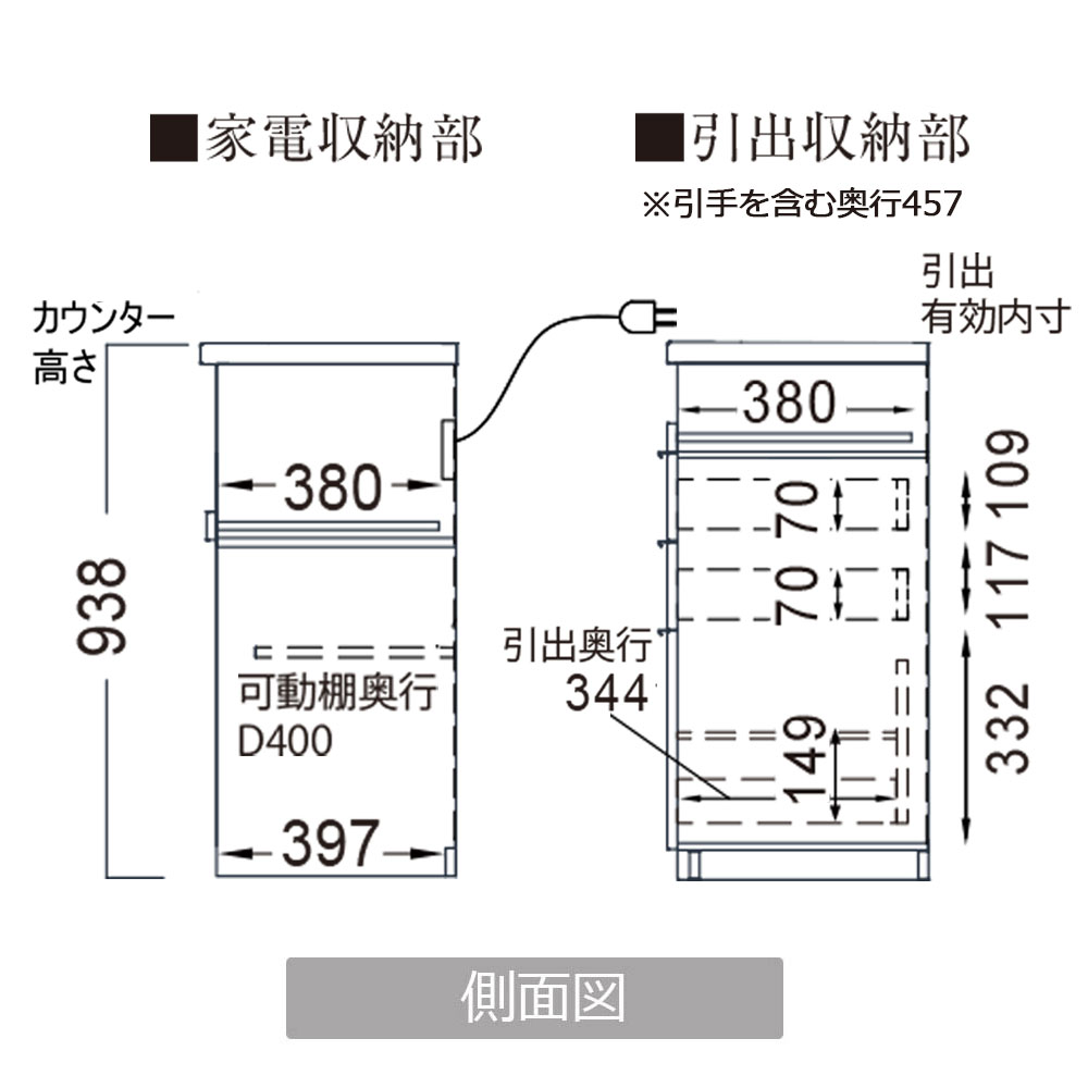 家電収納部分:幅537x奥行380x高さ275