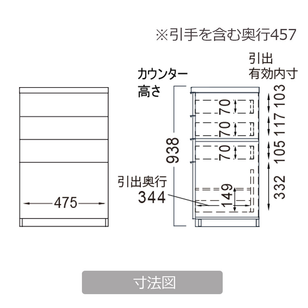 オープンボードと並べることで収納力をアップできるIDシリーズのカウンターアイテムです。4段引出しでたっぷり収納ができます。お部屋のインテリアに合わせて選べるパールホワイト、セラミカネロ、グレイッシュナットの3色展開です。スリムな奥行き44.5cmタイプです。※画像はイメージです。