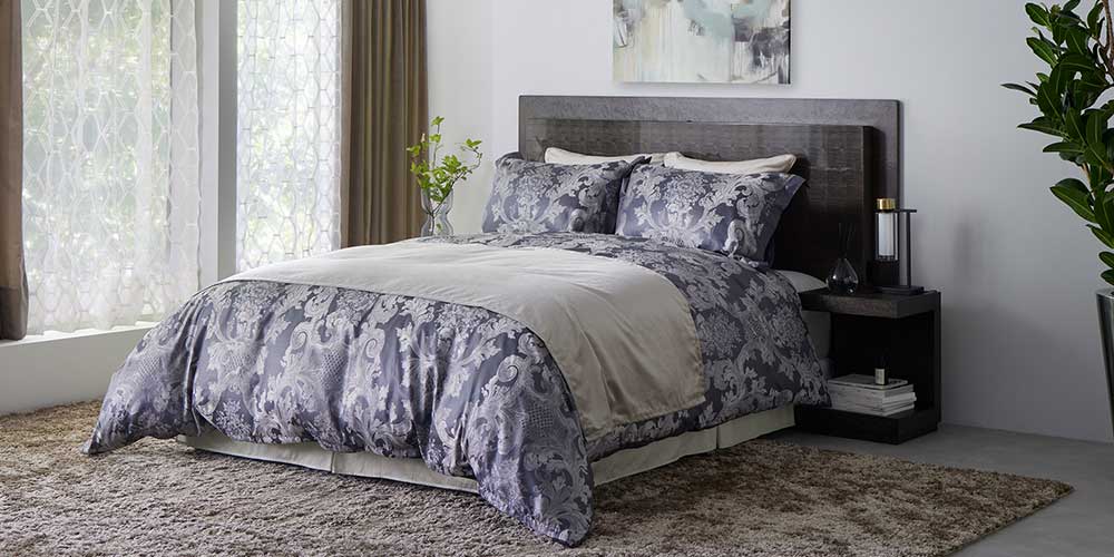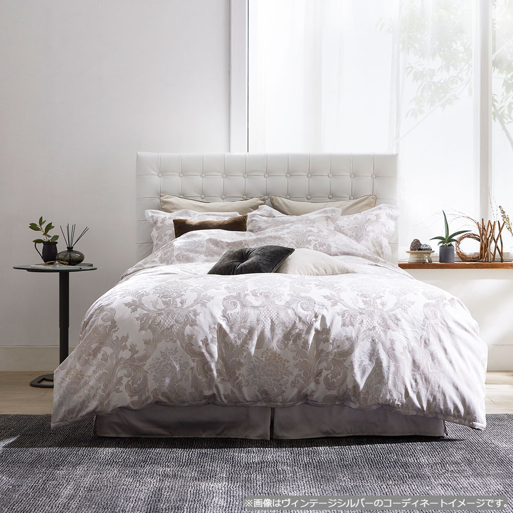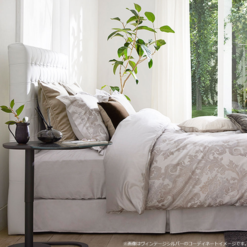 ベッドスカートはボトムクッション下の目隠しとなり、ほこりや汚れを防ぐだけでなく、装飾性を高め、ホテルライクなベッドルームを演出します。「ルイ14世」シリーズのまくらカバーと掛け布団カバーには豪華な植物紋様をジャガード織で施しており、ラグジュアリーな空間にぴったりです。※ベッドスカートは無地(サテン織)です。