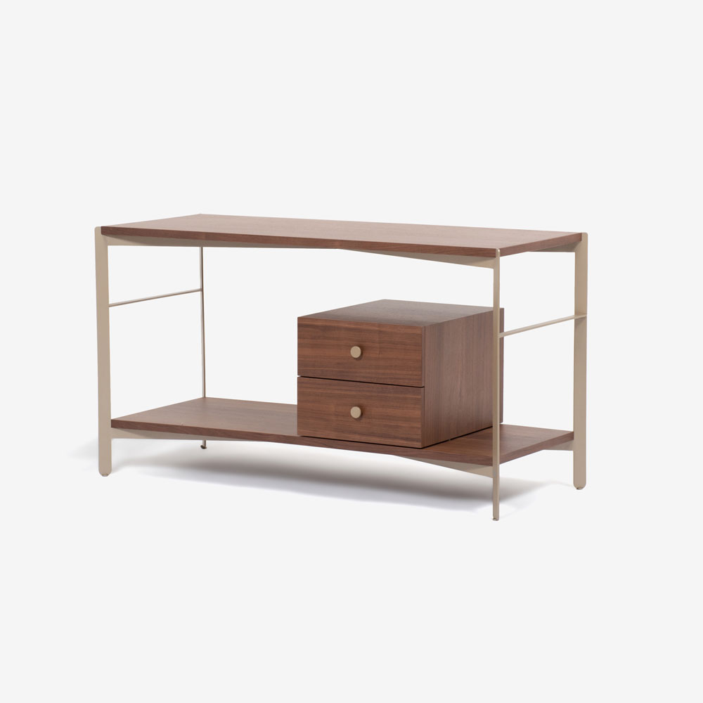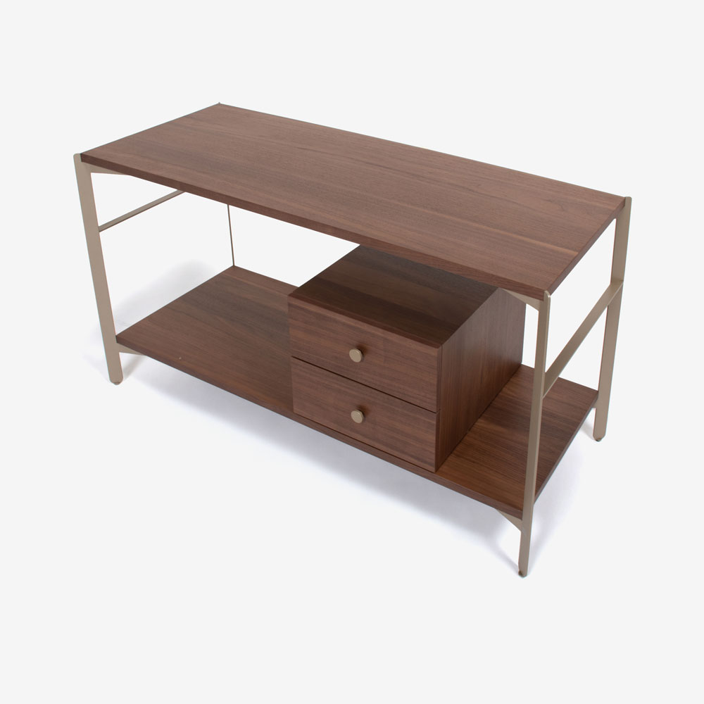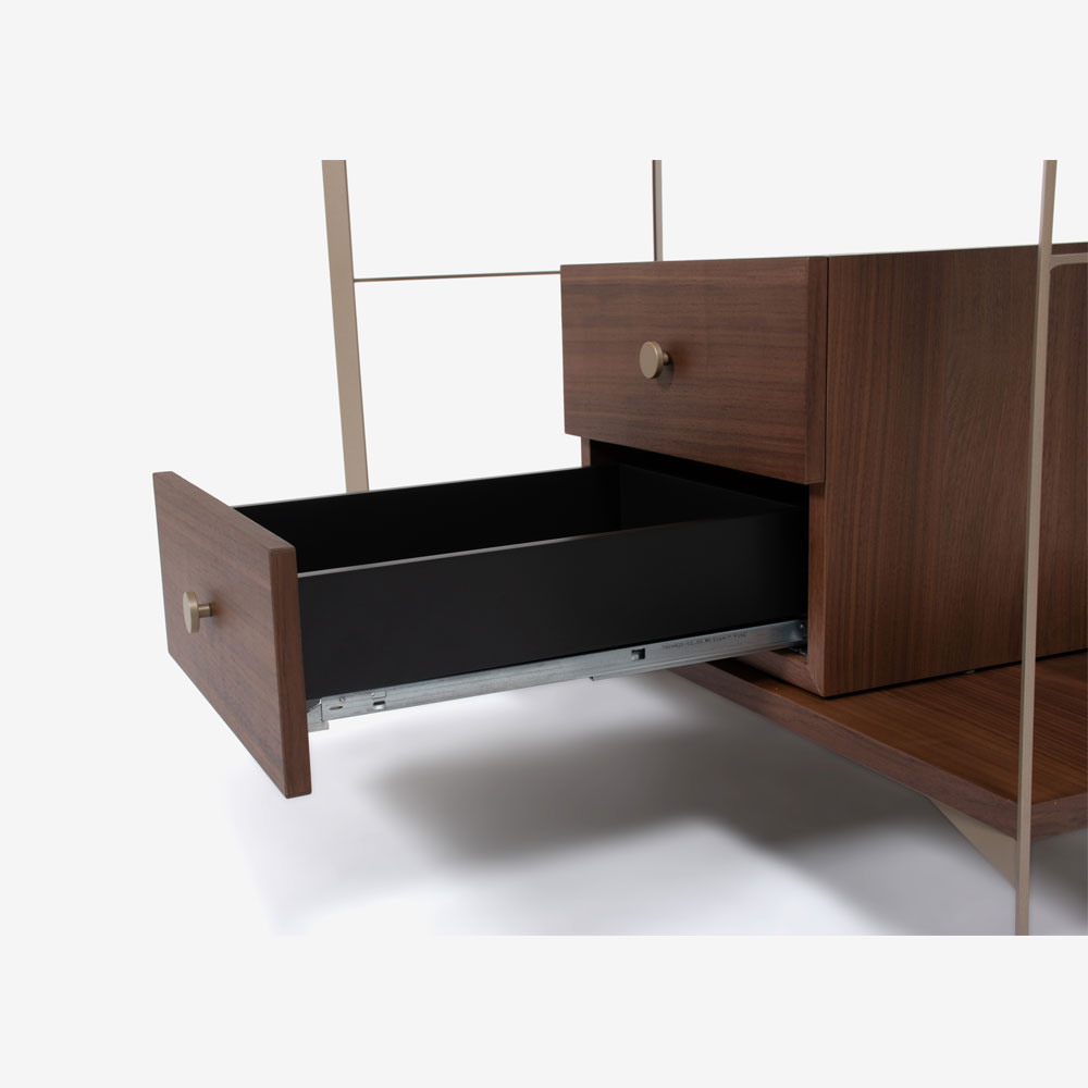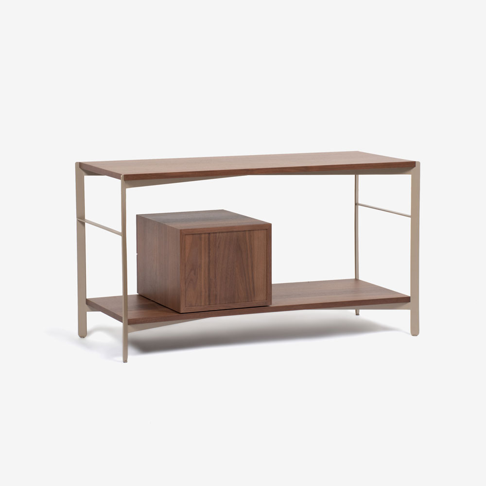 ウォールナット材のボックスと棚板をメタルのフレームと合わせた、シェルフのように圧迫感のないサイドボードです。視線が抜けるため、すっきりとした印象が魅力です。