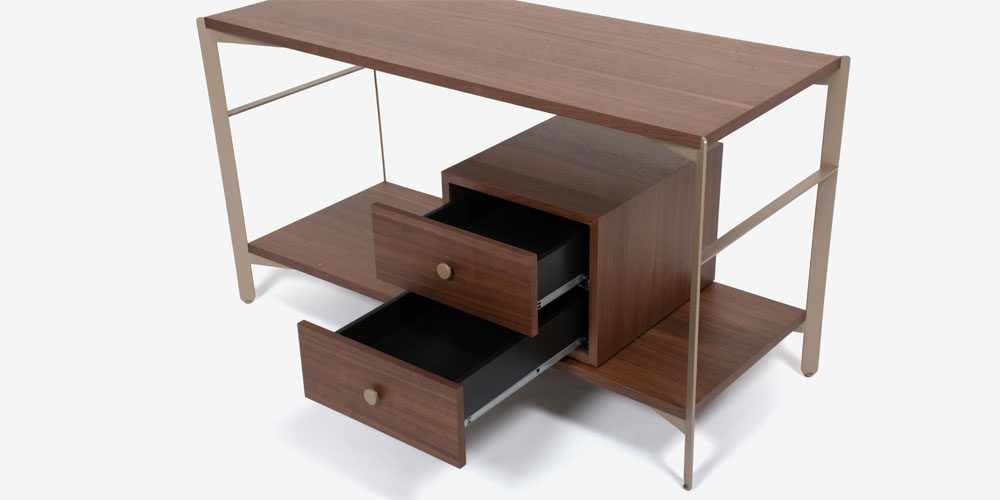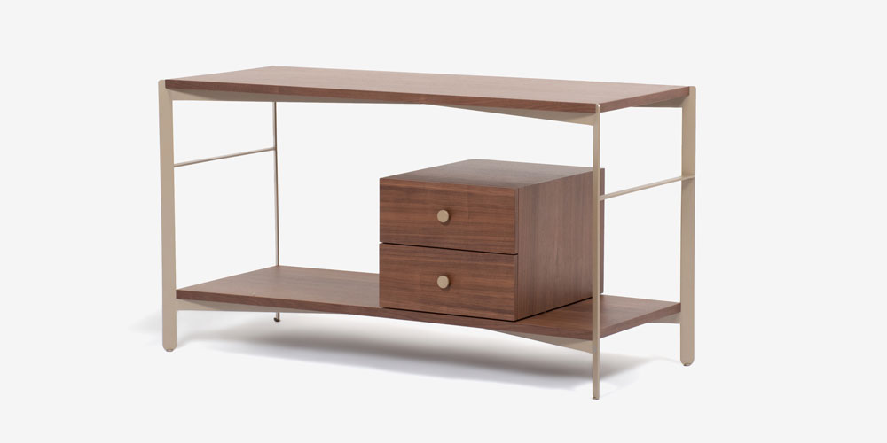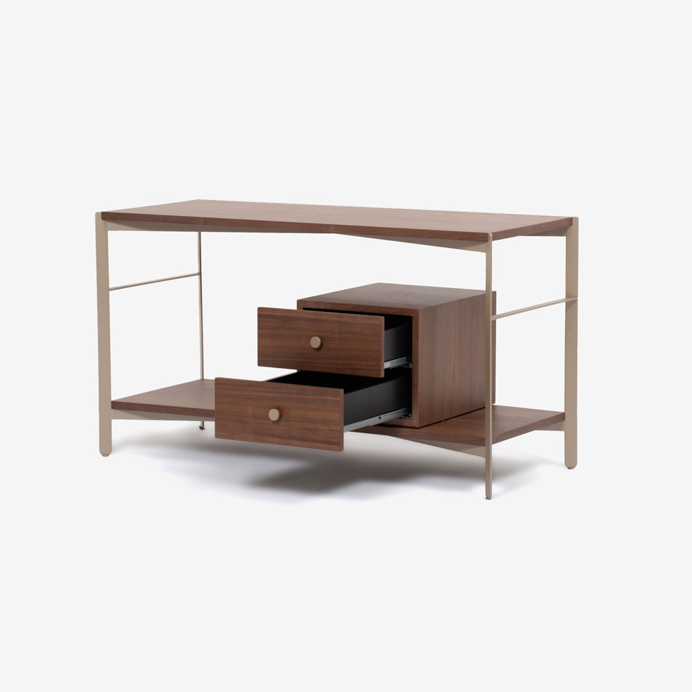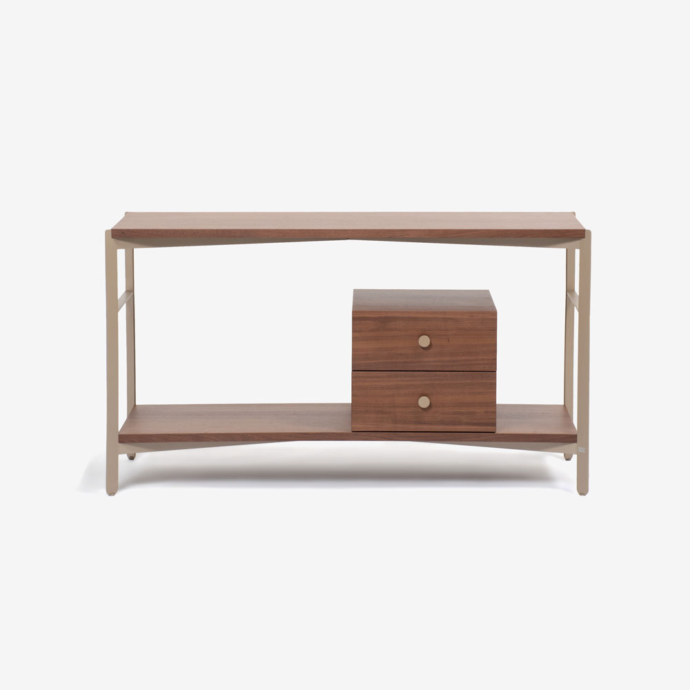 ウォールナット材のボックスと棚板をメタルのフレームと合わせた、シェルフのように圧迫感のないサイドボードです。視線が抜けるため、すっきりとした印象が魅力です。
