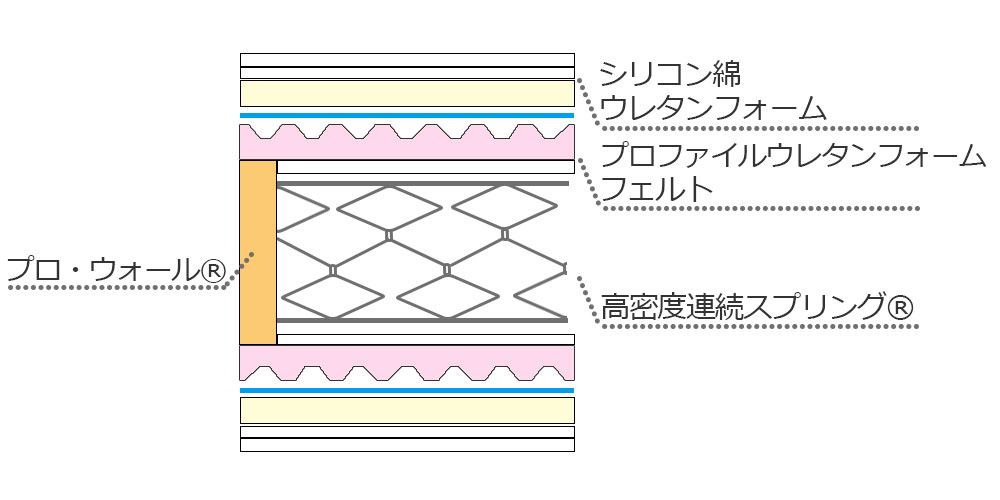 両面クッション入りのシングルデッキ仕様です。高密度連続スプリング®が荷重をしっかり支え、プロファイルウレタンを使用したクッション層がフィット感のある寝心地です。プロウォール®で強化することで、マットレスの端まで広くお使いいただけます。※画像はイメージです。
