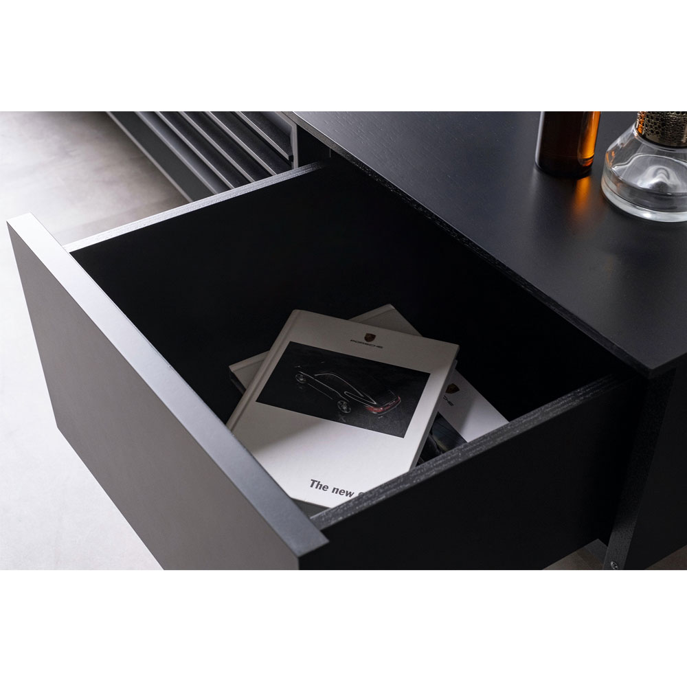 繊細なスリットライン構成で、オリジナリティに富んだモダンスタイルのテレビボードライン。脚高が16cmあるため、すっきりとした印象のデザインに仕上がっています。
