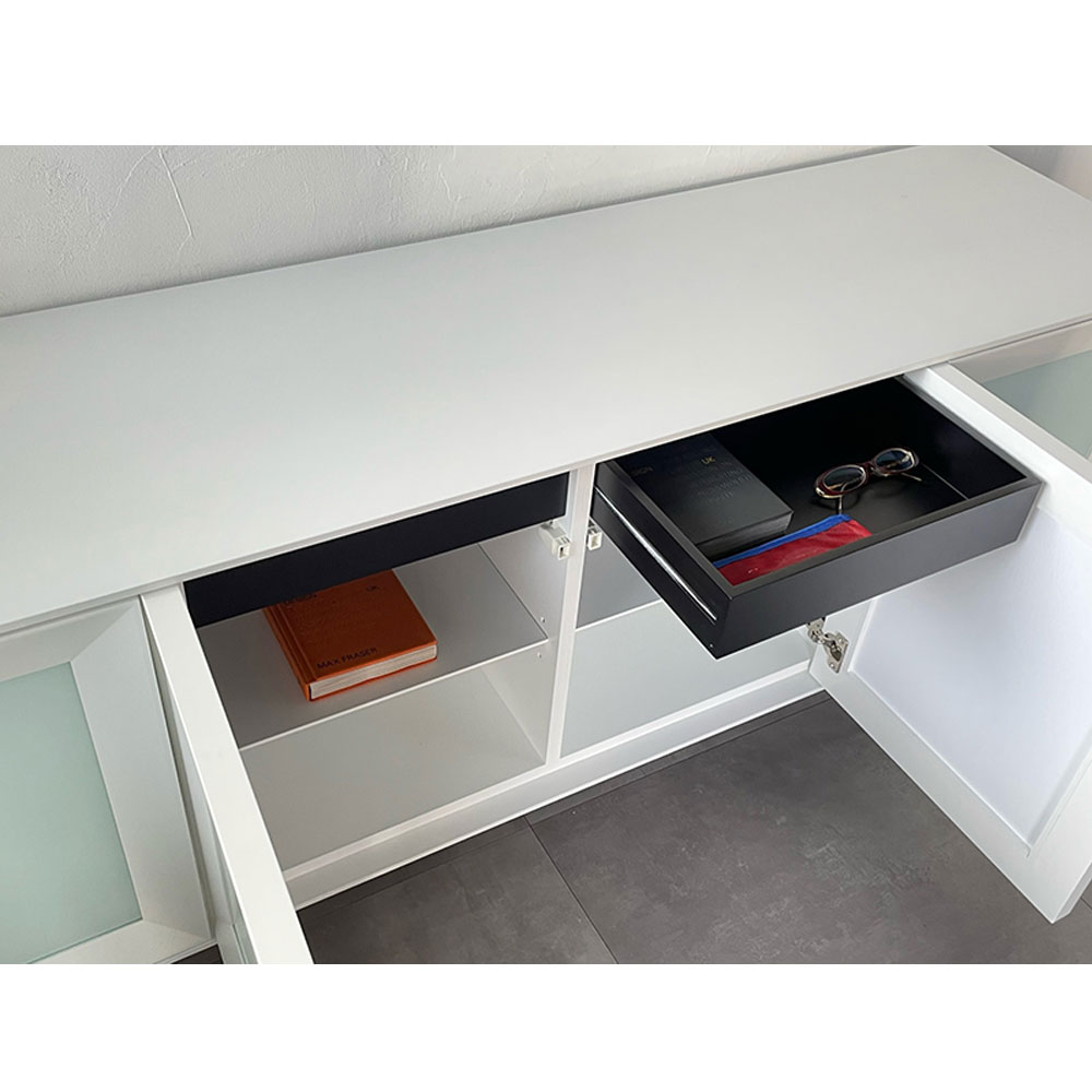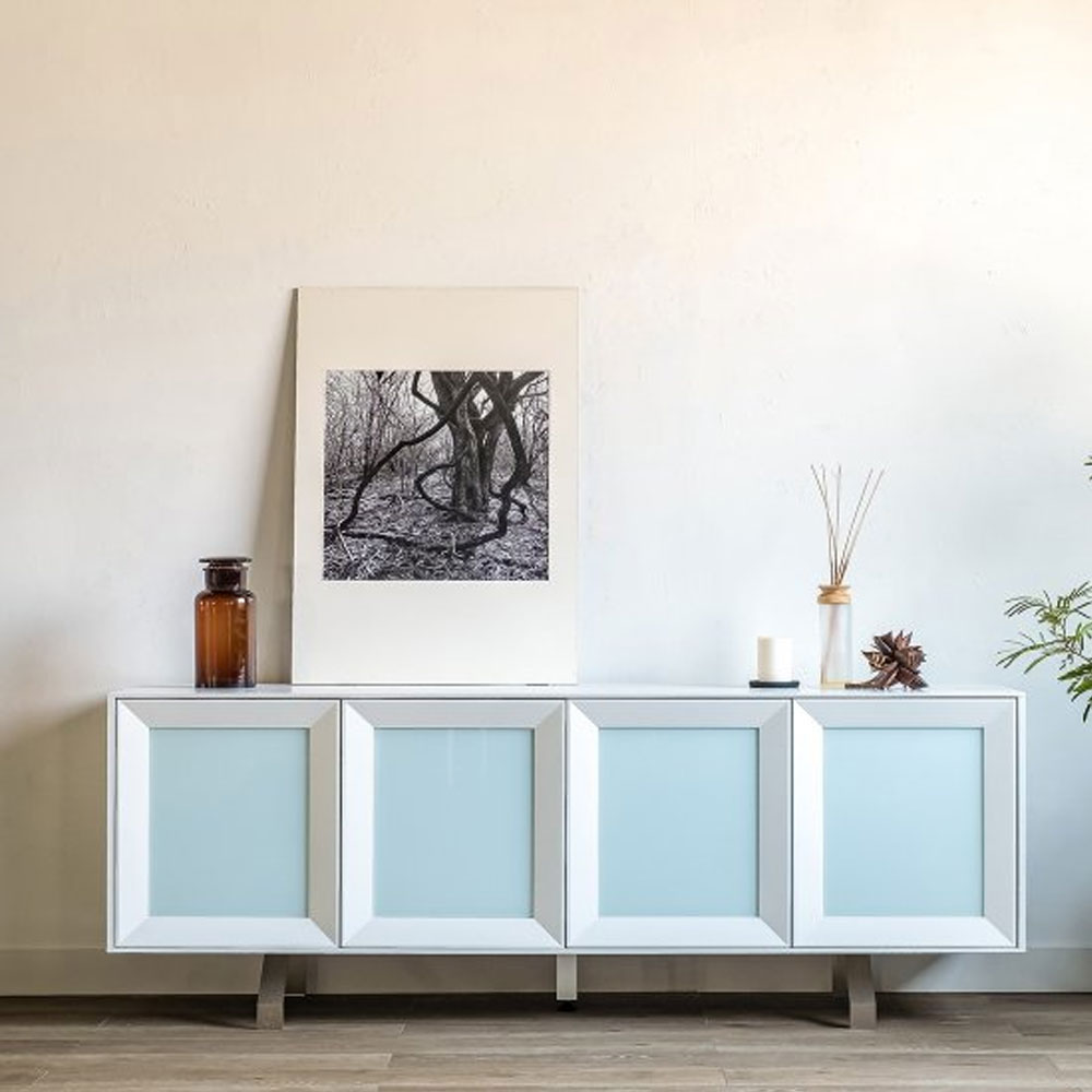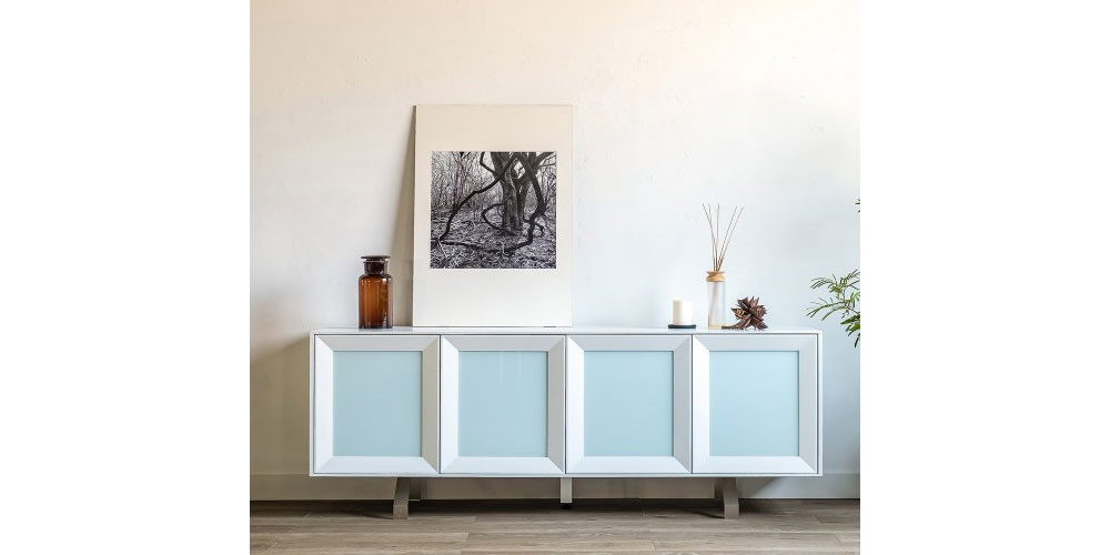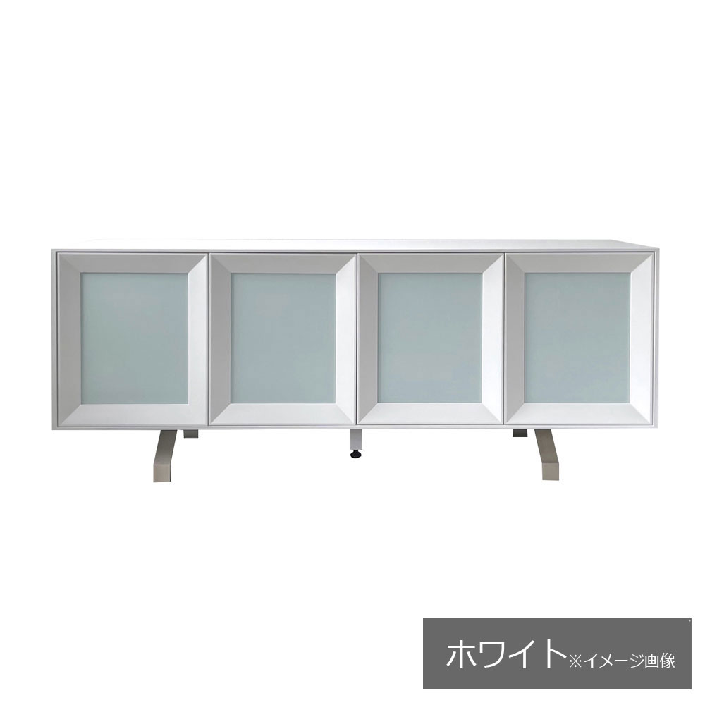 テーパーに削った扉枠が光の陰影で美しく立体感のある表情が特徴のサイドボード。古来からの技法「梨地塗装」を採用し繊細な表面のマットな質感を表現。ボディから抜き出たエッジの効いたヘアライン仕上げのスチール脚もデザインのポイントです。